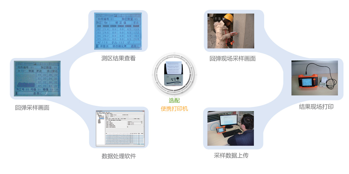 ⑤选配便携式打印机可以随时进行原始回弹值、测区或构件强度值的打印。特别适合现场会议、政府部门组织的工程质量检测,各职权部门进行的监督抽查等。